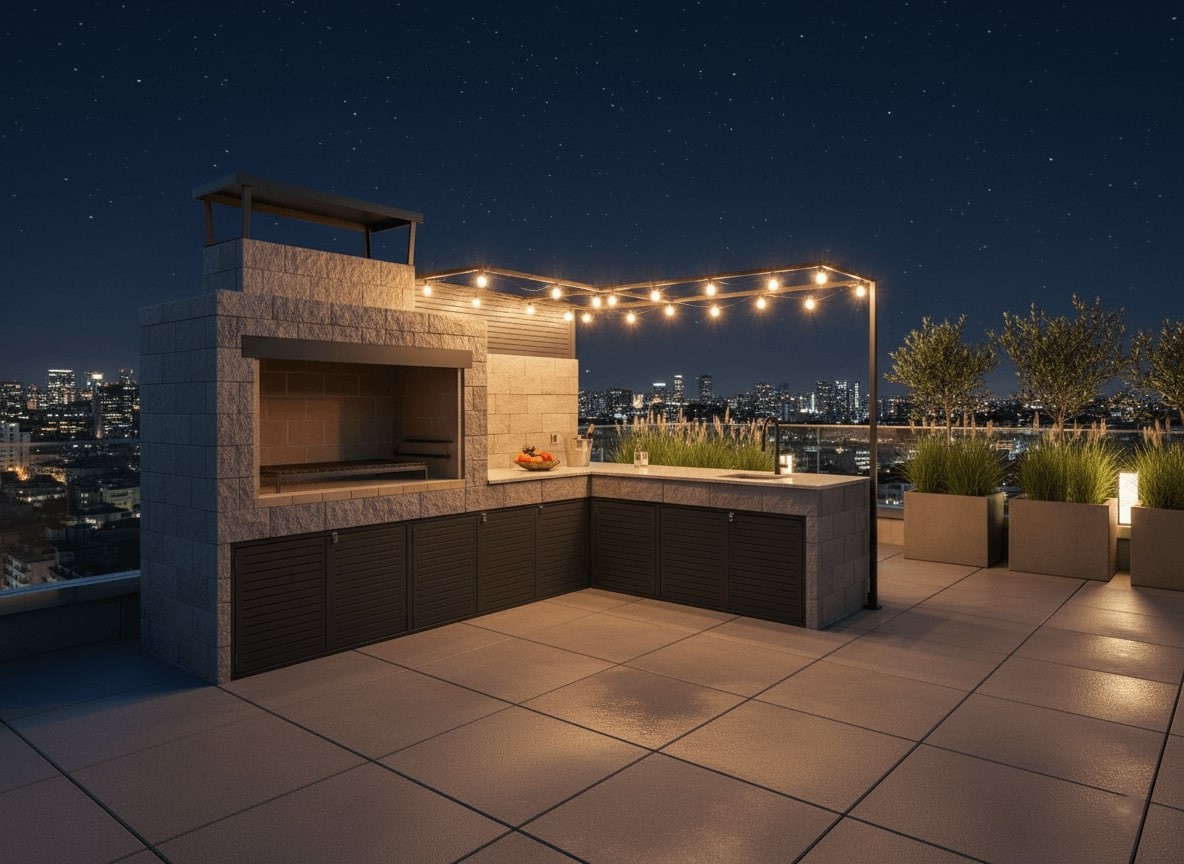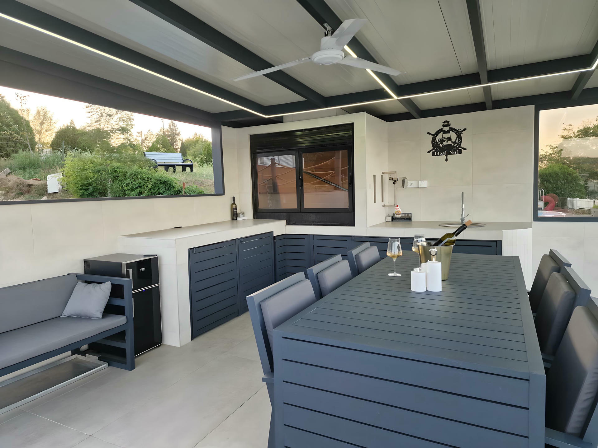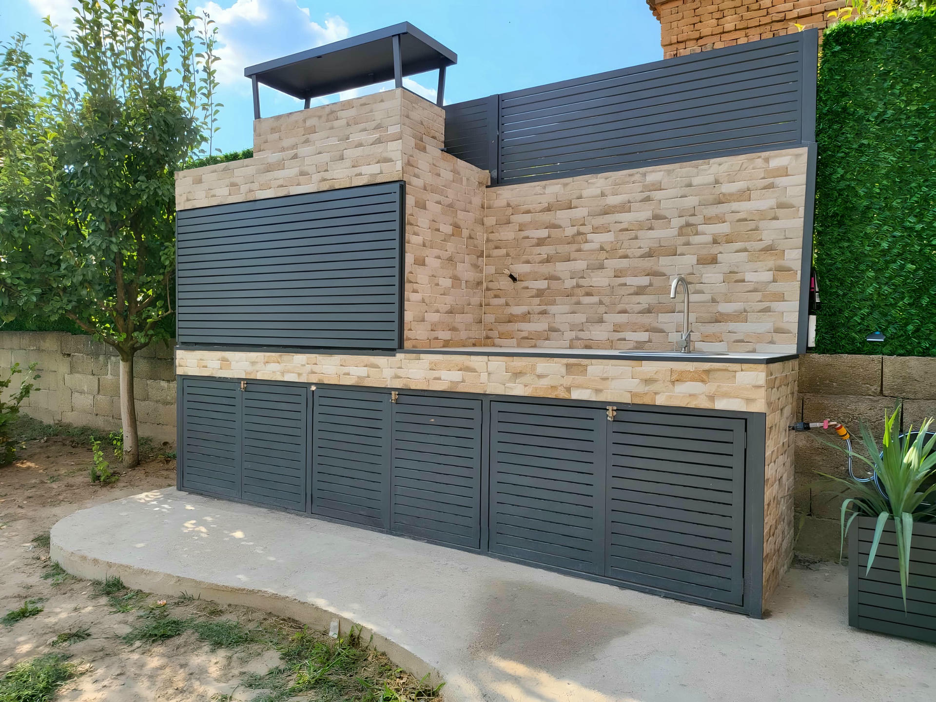 Baštenska kuhinja izrađena od aluminijumskih lamel vrata i panela u kombinaciji sa dekorativnim zidnim oblogama od kamena pruža savršen spoj funkcionalnosti i estetike.