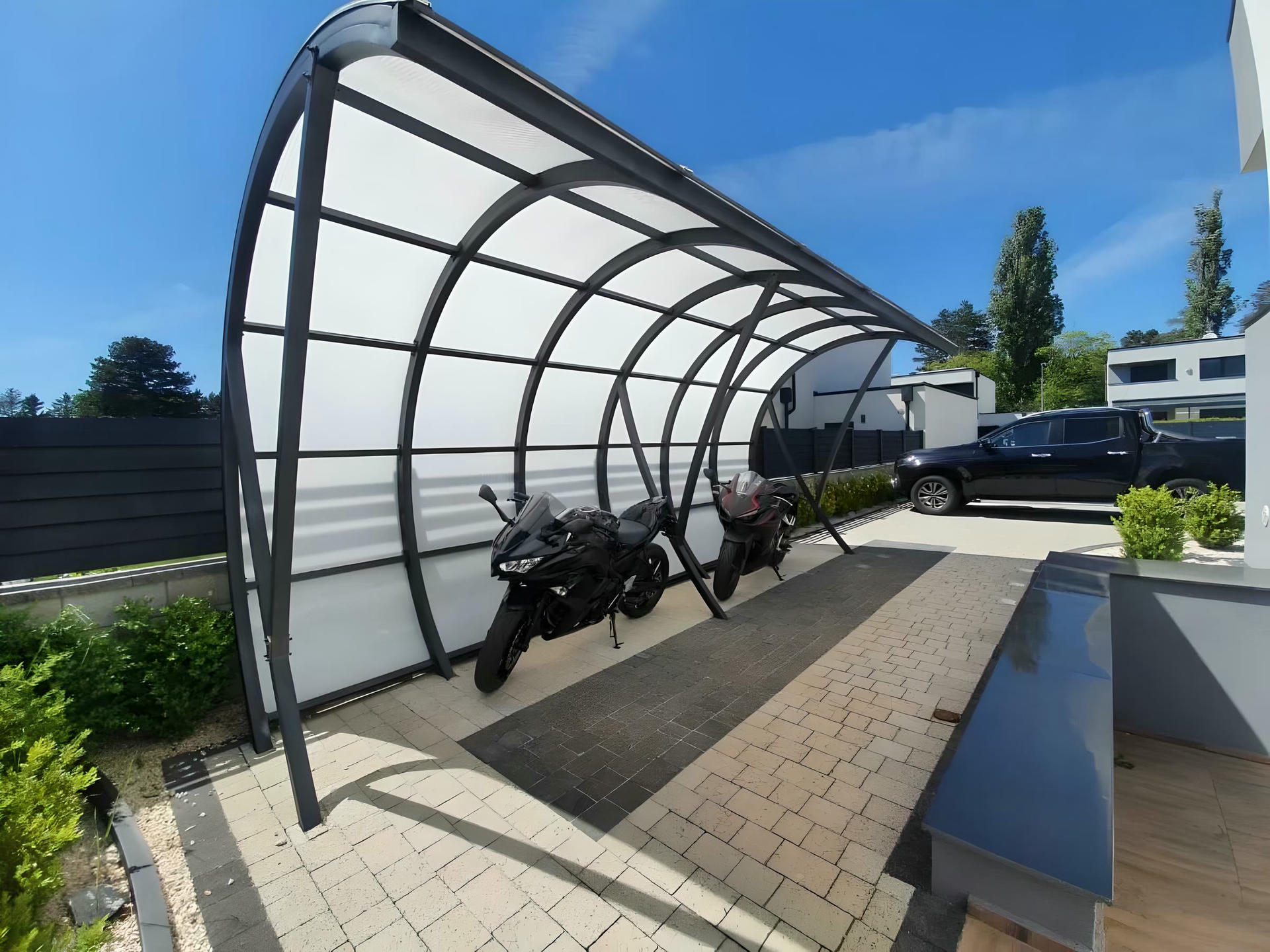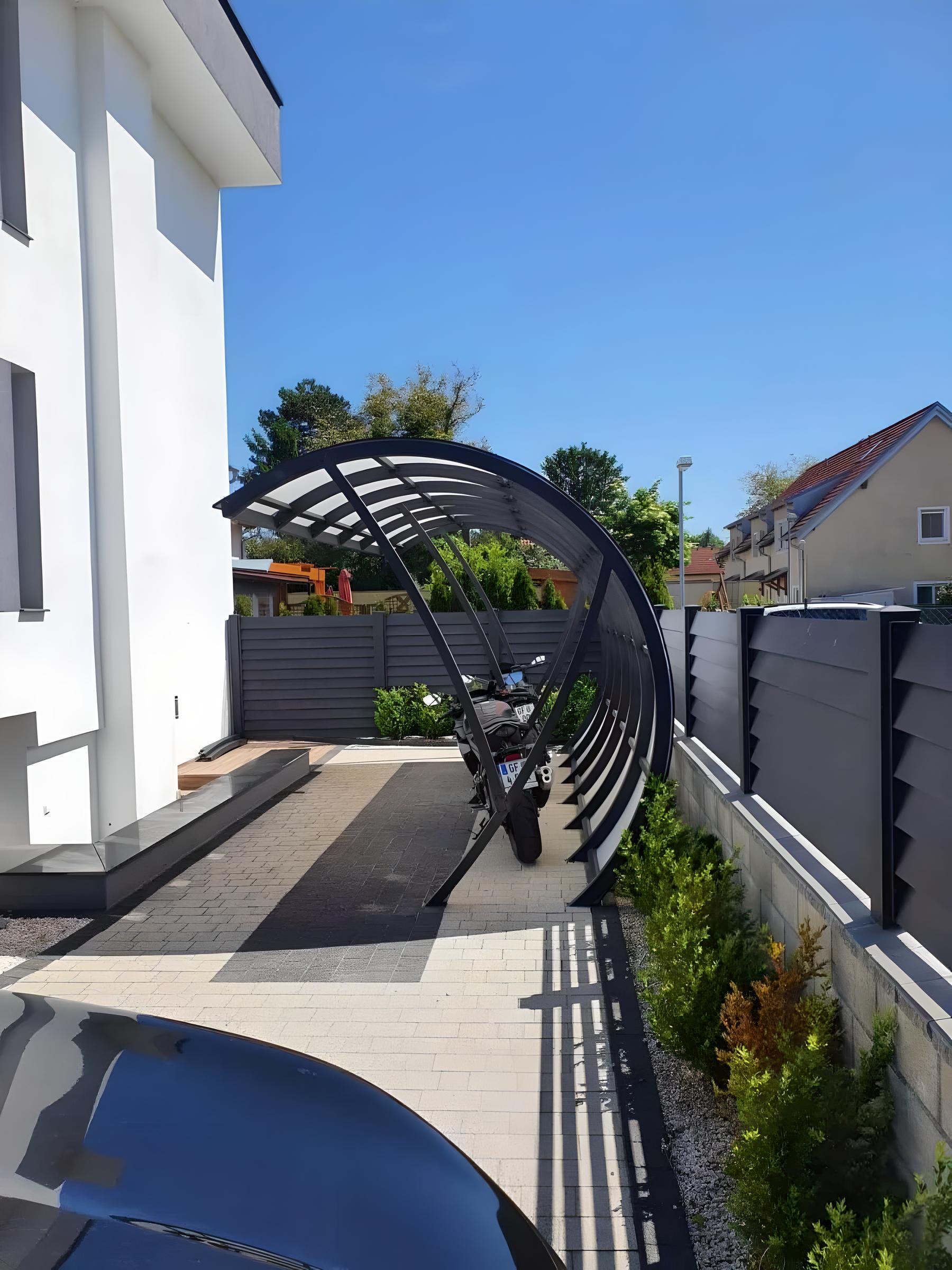 Zakrivljena konstrukcija pruža optimalnu zaštitu od kiše, snega i sunca, dok transparentni paneli unose vizuelnu lakoću i svetlost u prostor.