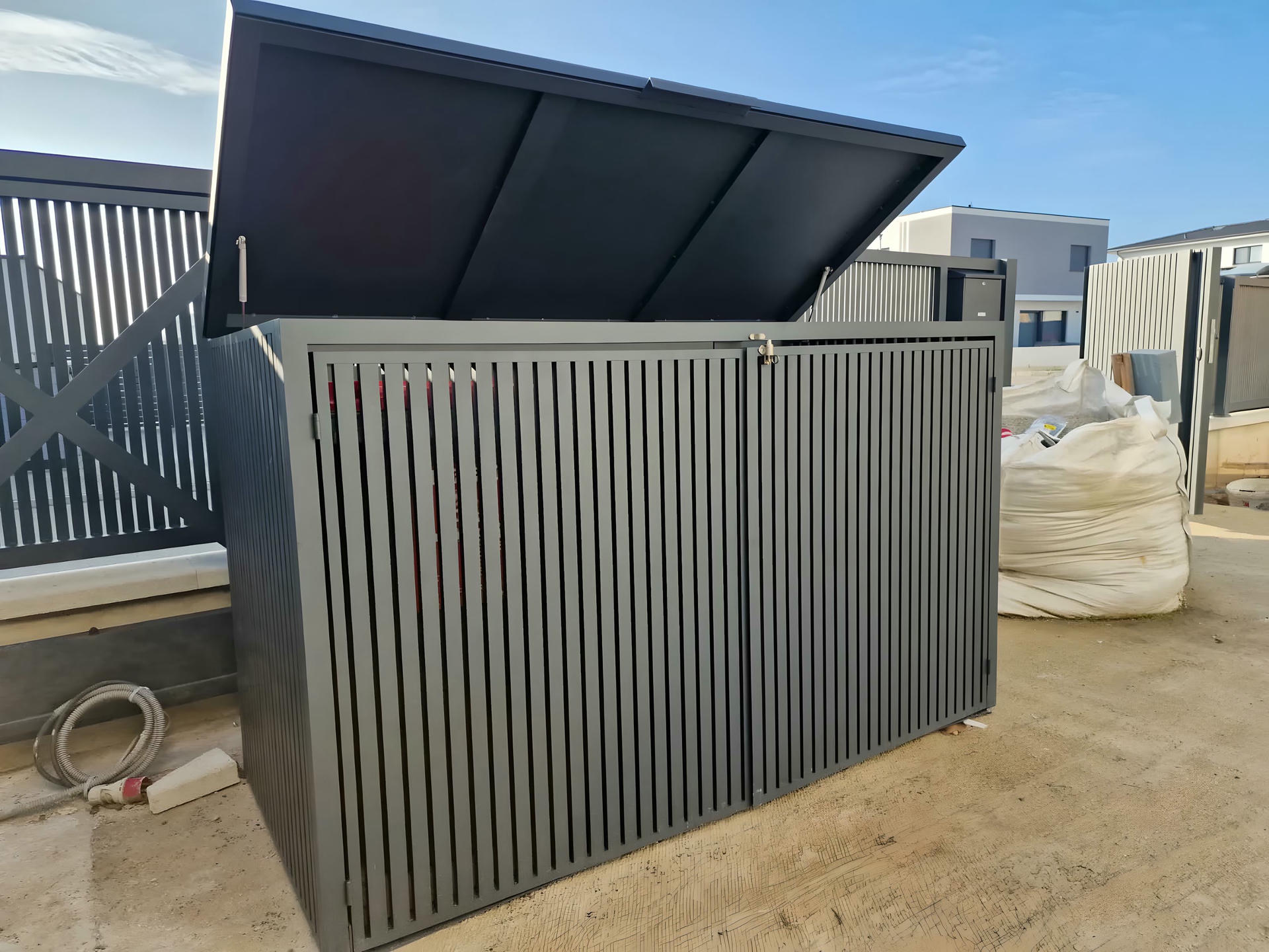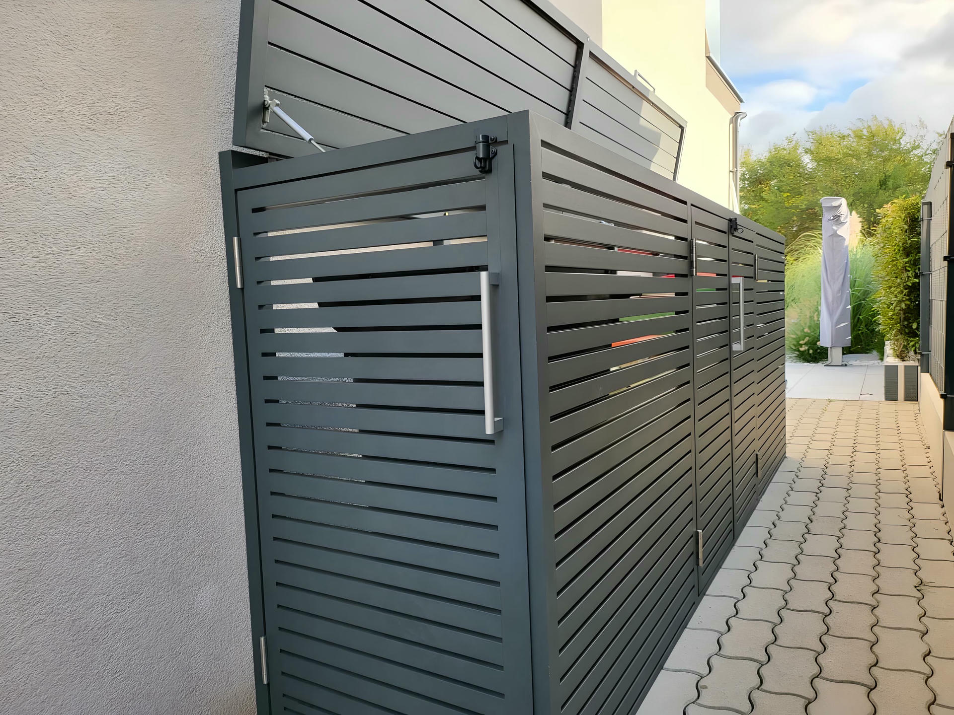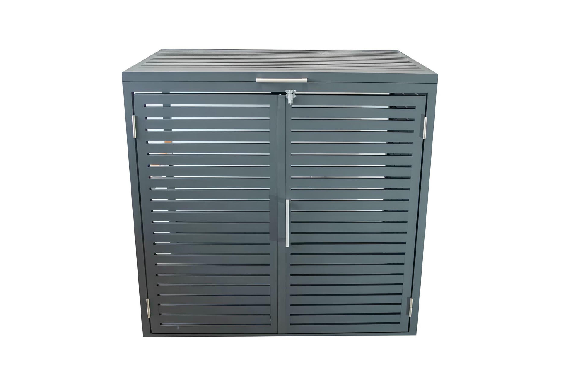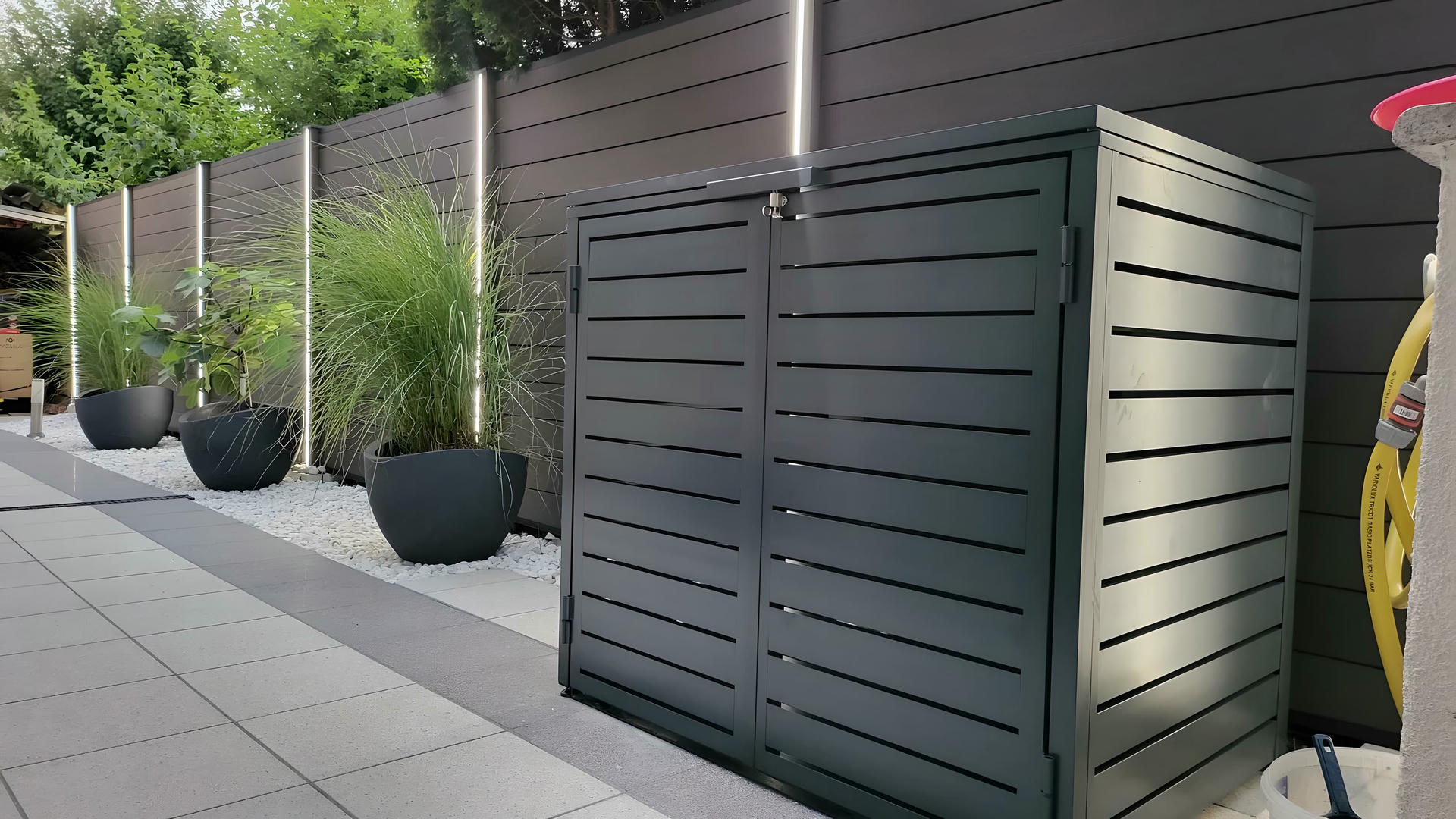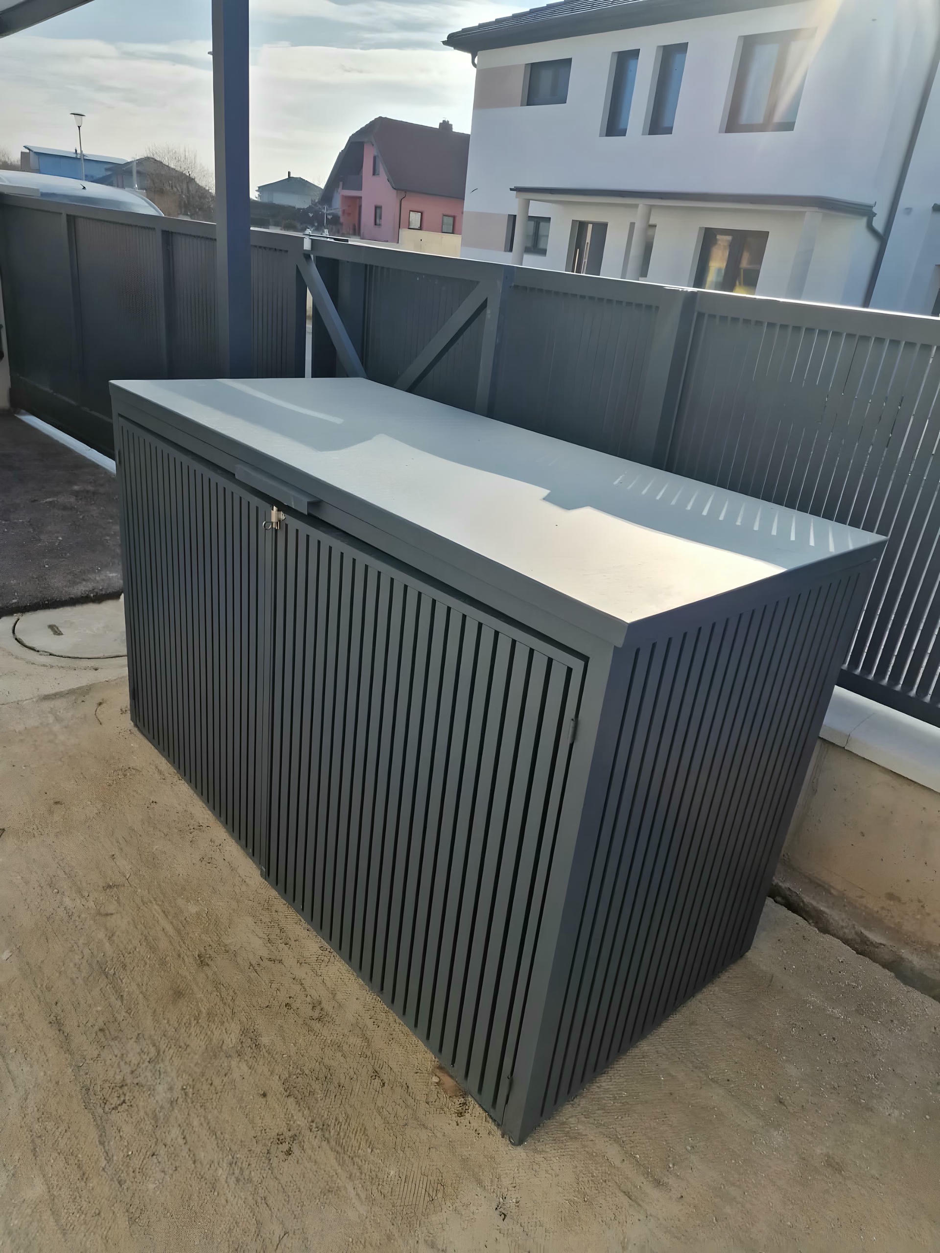 Izrađena sa ravnim horizontalnim lamelama u uravnoteženom okviru, ova kutija ne samo da efikasno skriva kante za otpatke, već i oplemenjuje spoljašnje prostore svojim smirenim i uređenim izgledom.