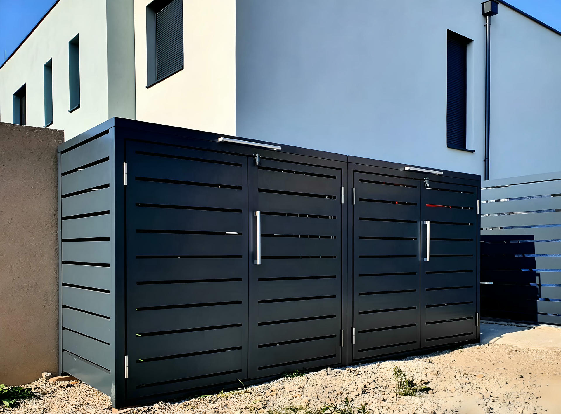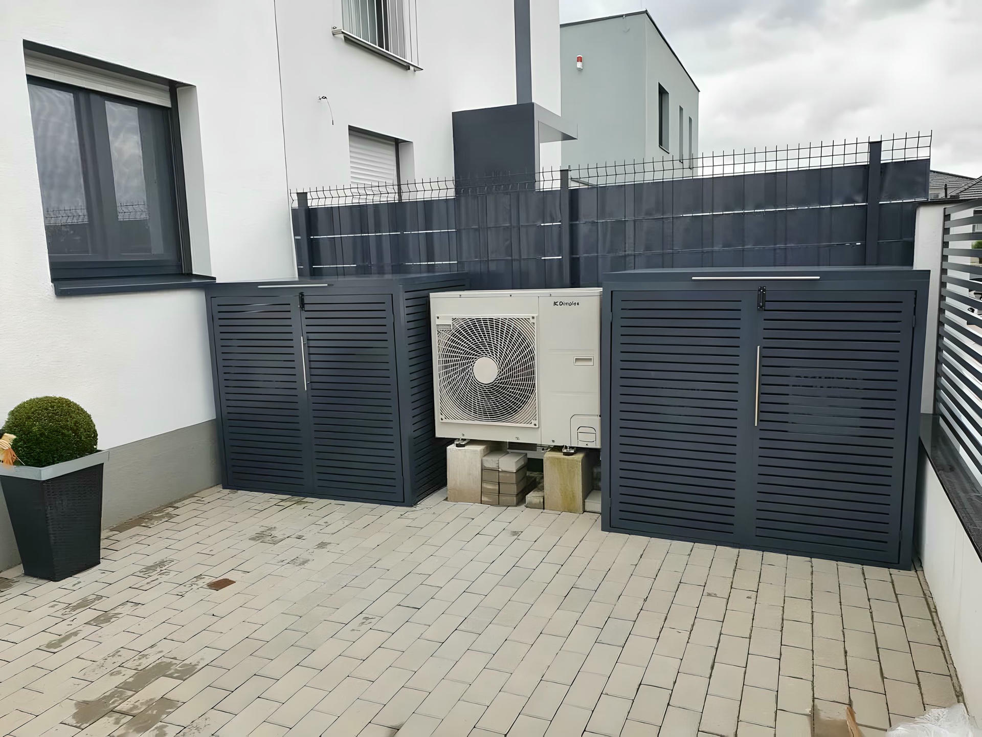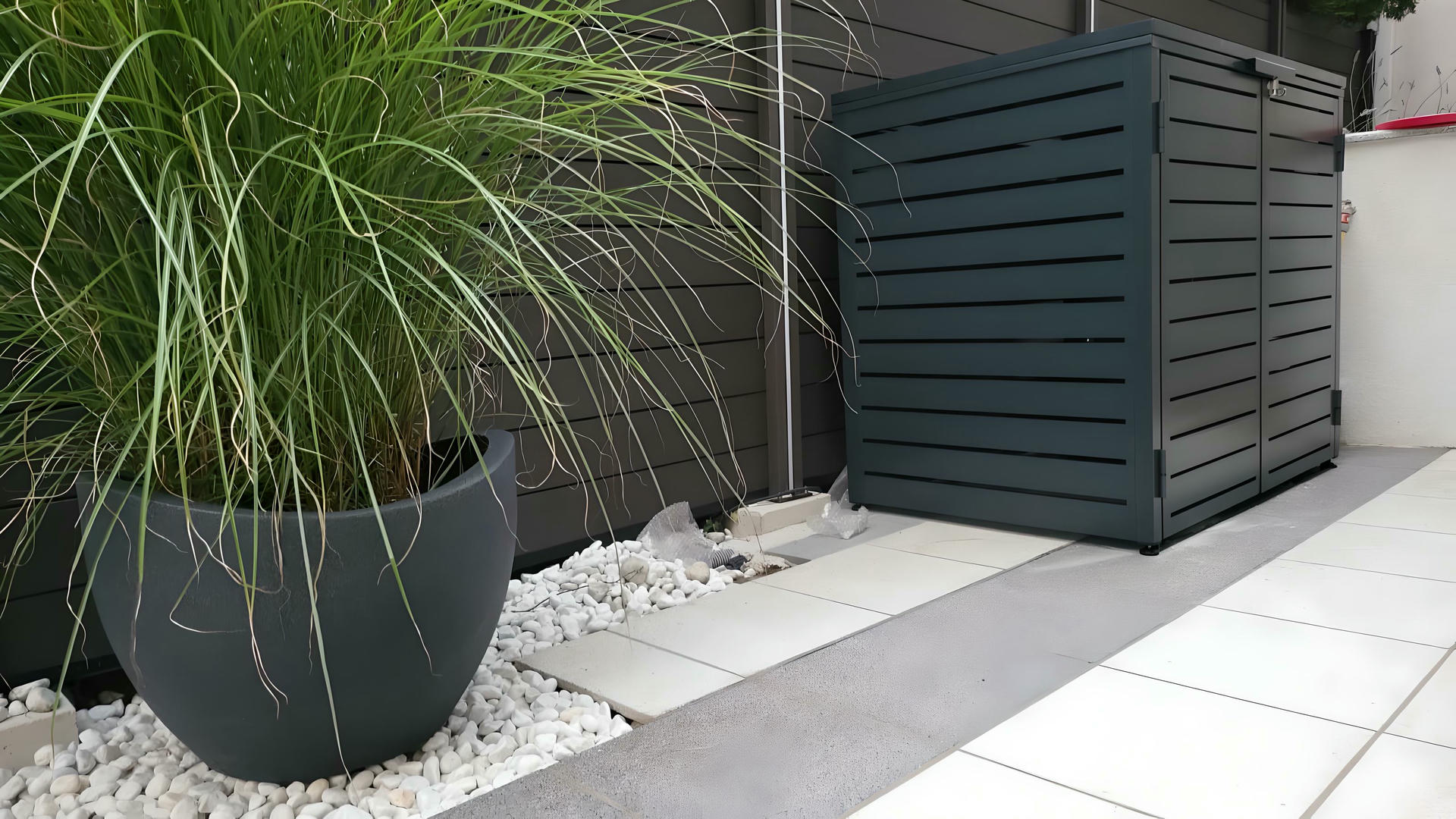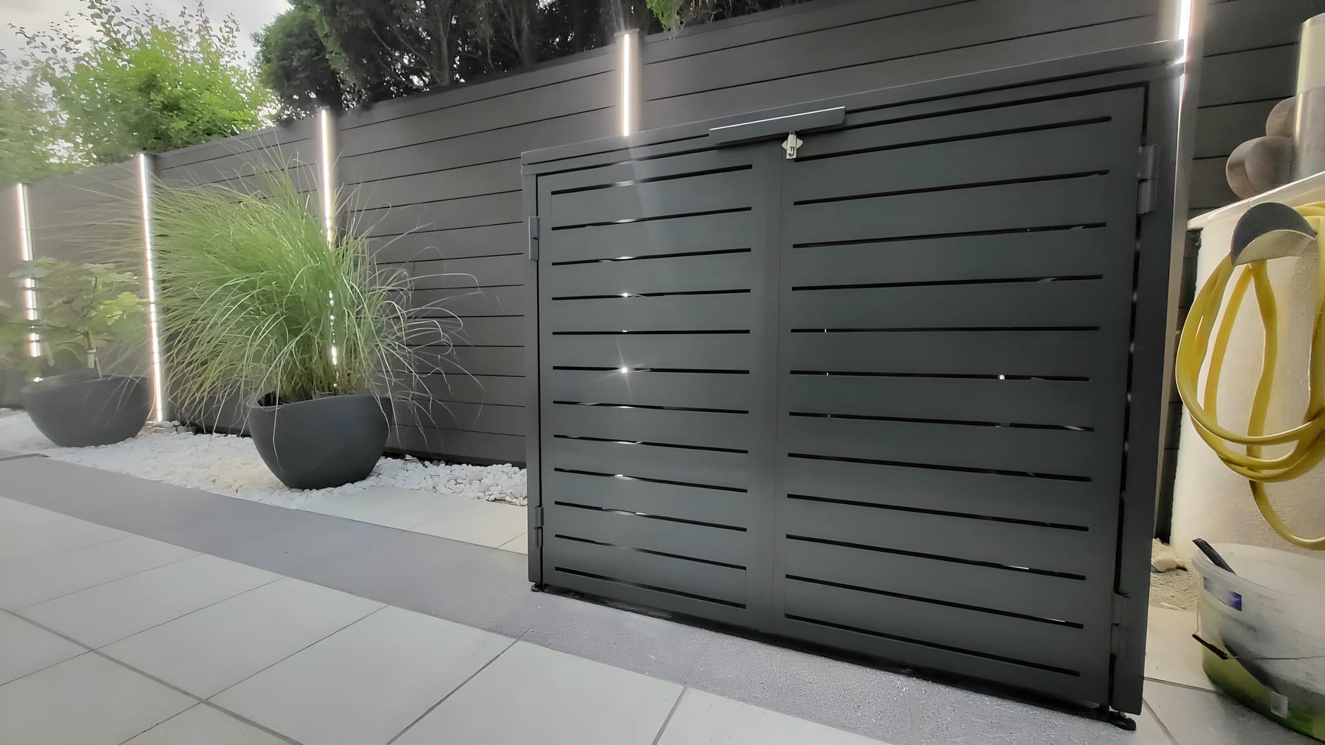 Izrađena sa ravnim horizontalnim lamelama u uravnoteženom okviru, ova kutija ne samo da efikasno skriva kante za otpatke, već i oplemenjuje spoljašnje prostore svojim smirenim i uređenim izgledom.