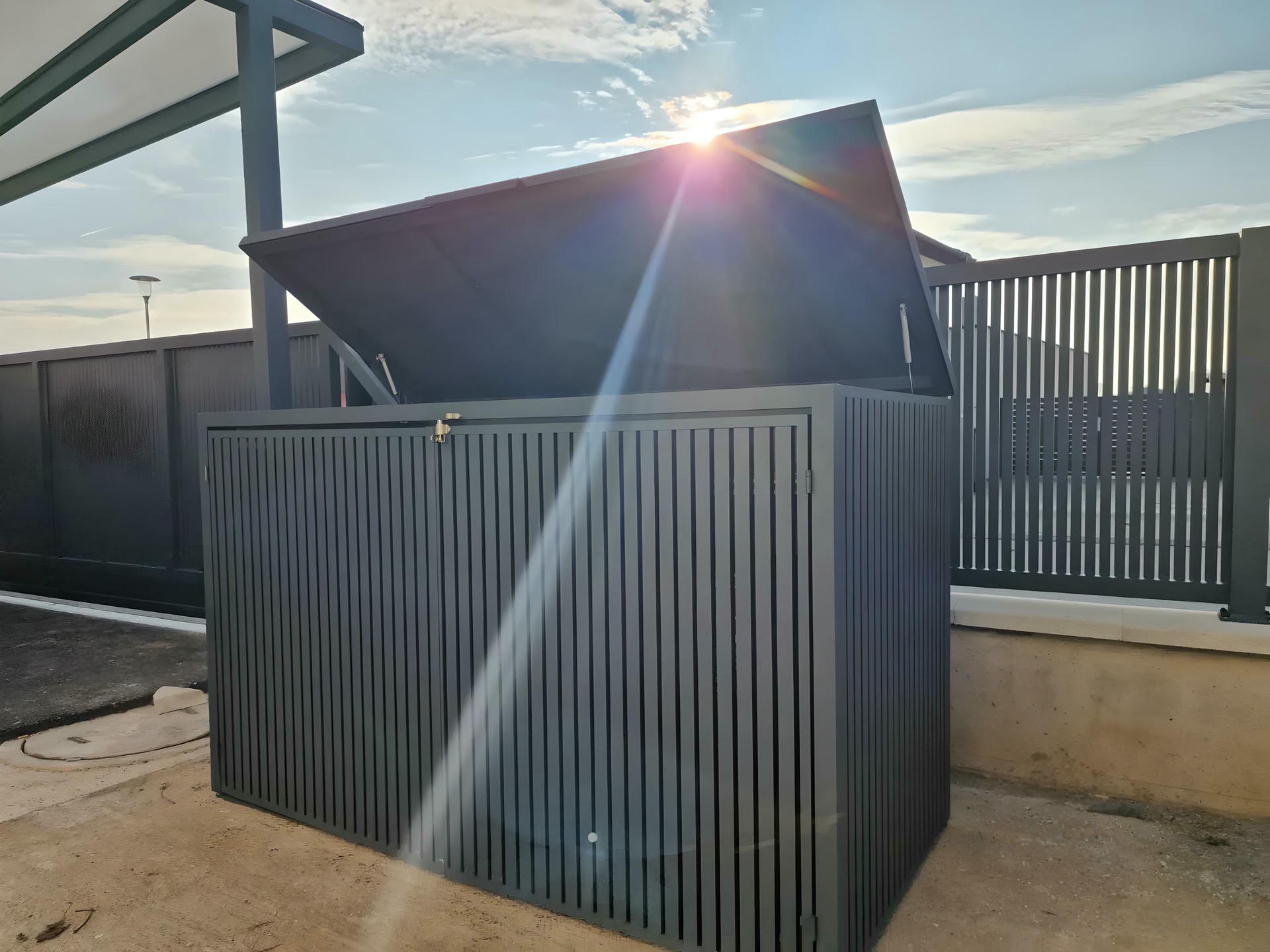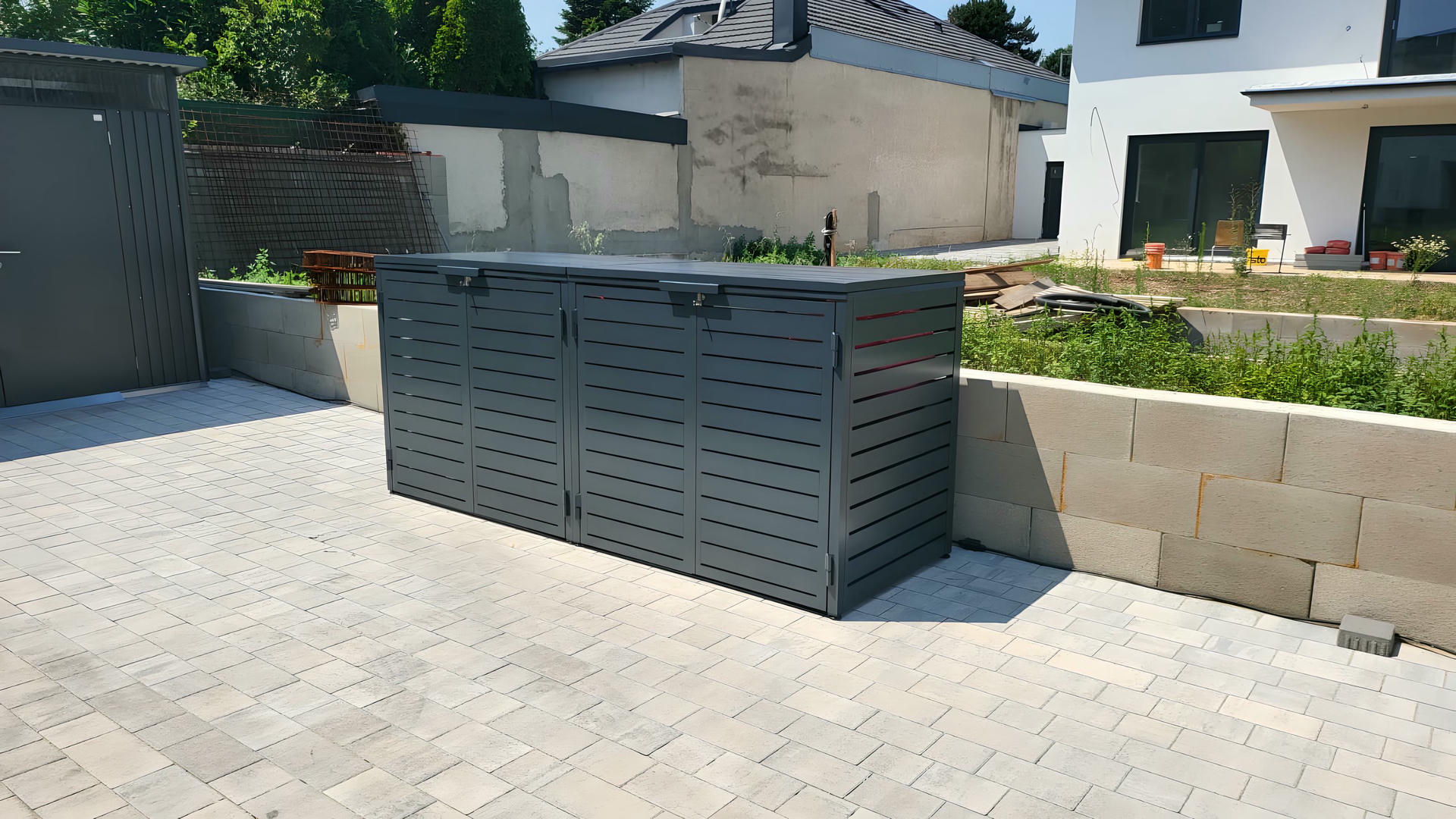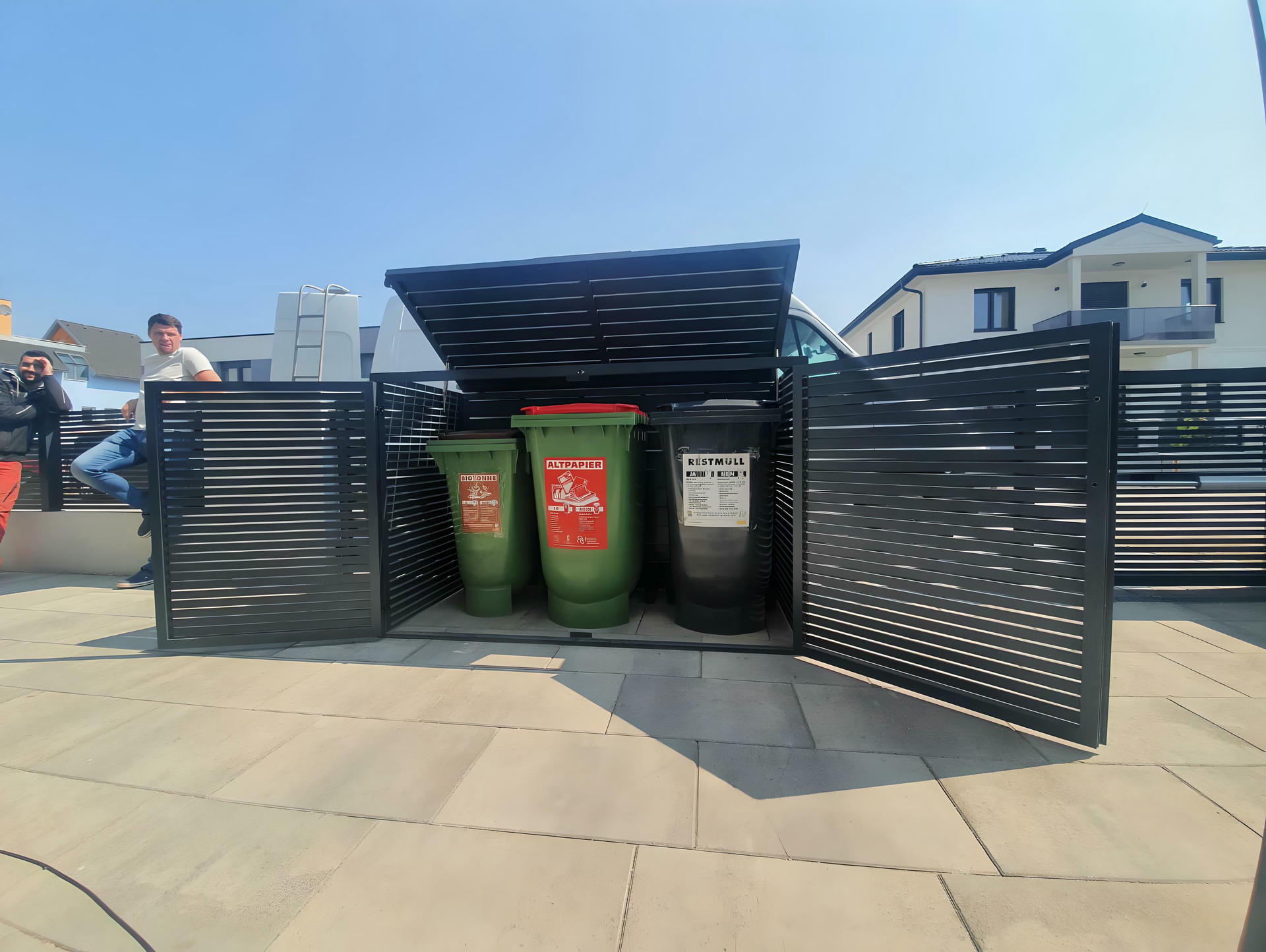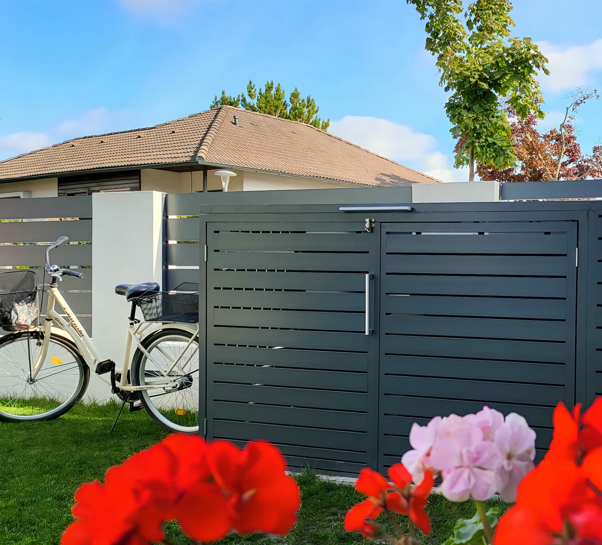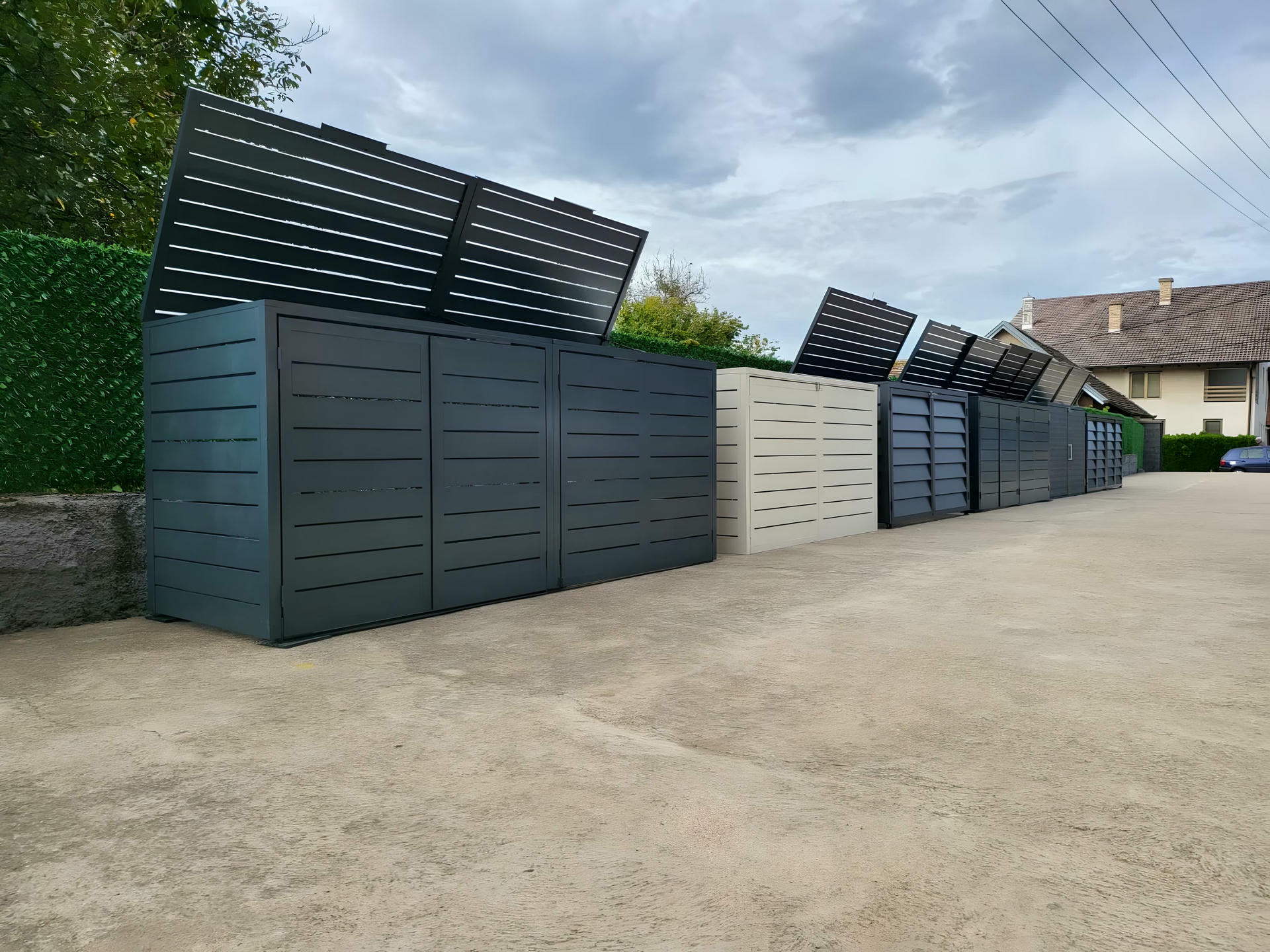 Izrađena sa ravnim horizontalnim lamelama u uravnoteženom okviru, ova kutija ne samo da efikasno skriva kante za otpatke, već i oplemenjuje spoljašnje prostore svojim smirenim i uređenim izgledom.