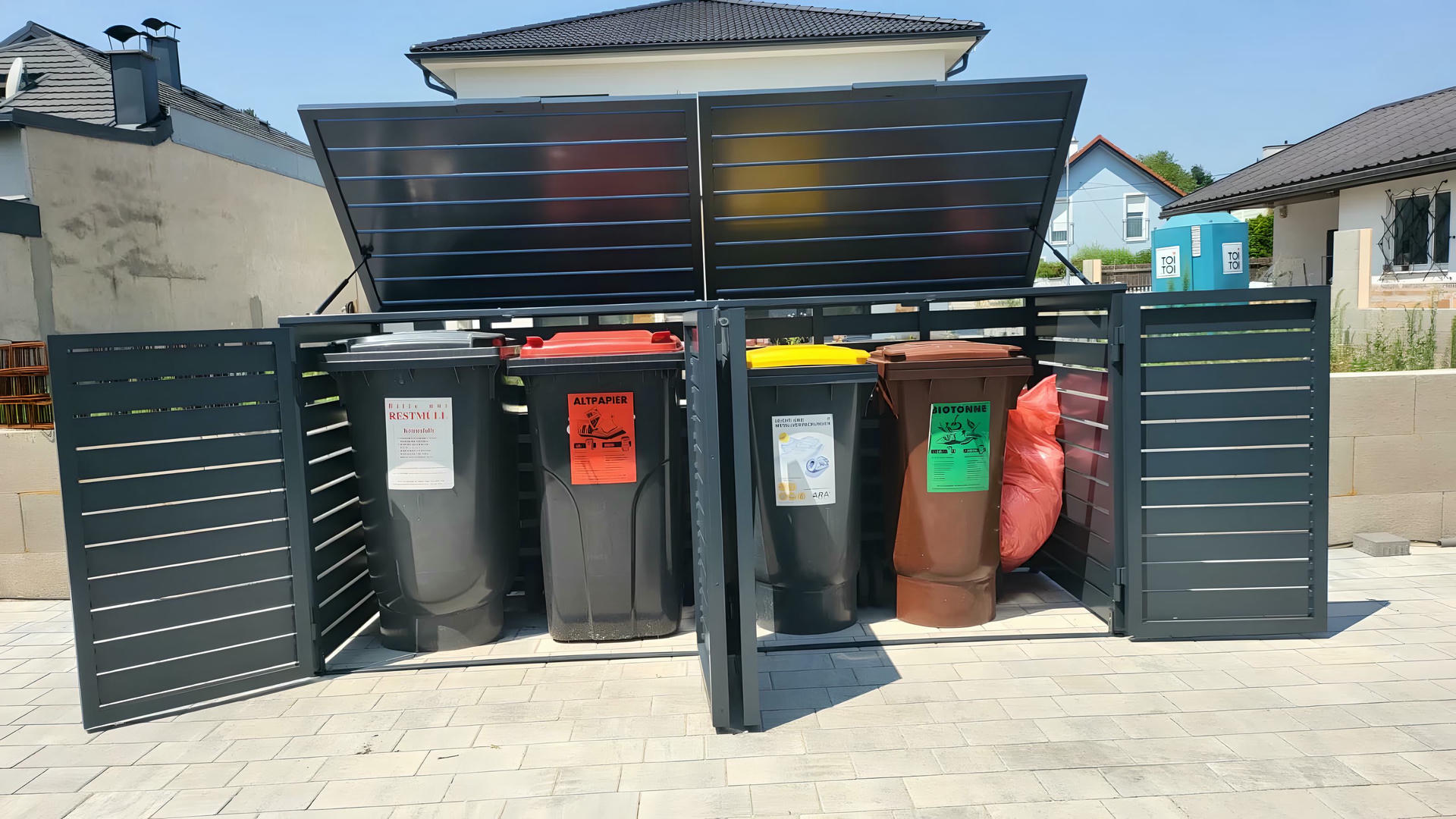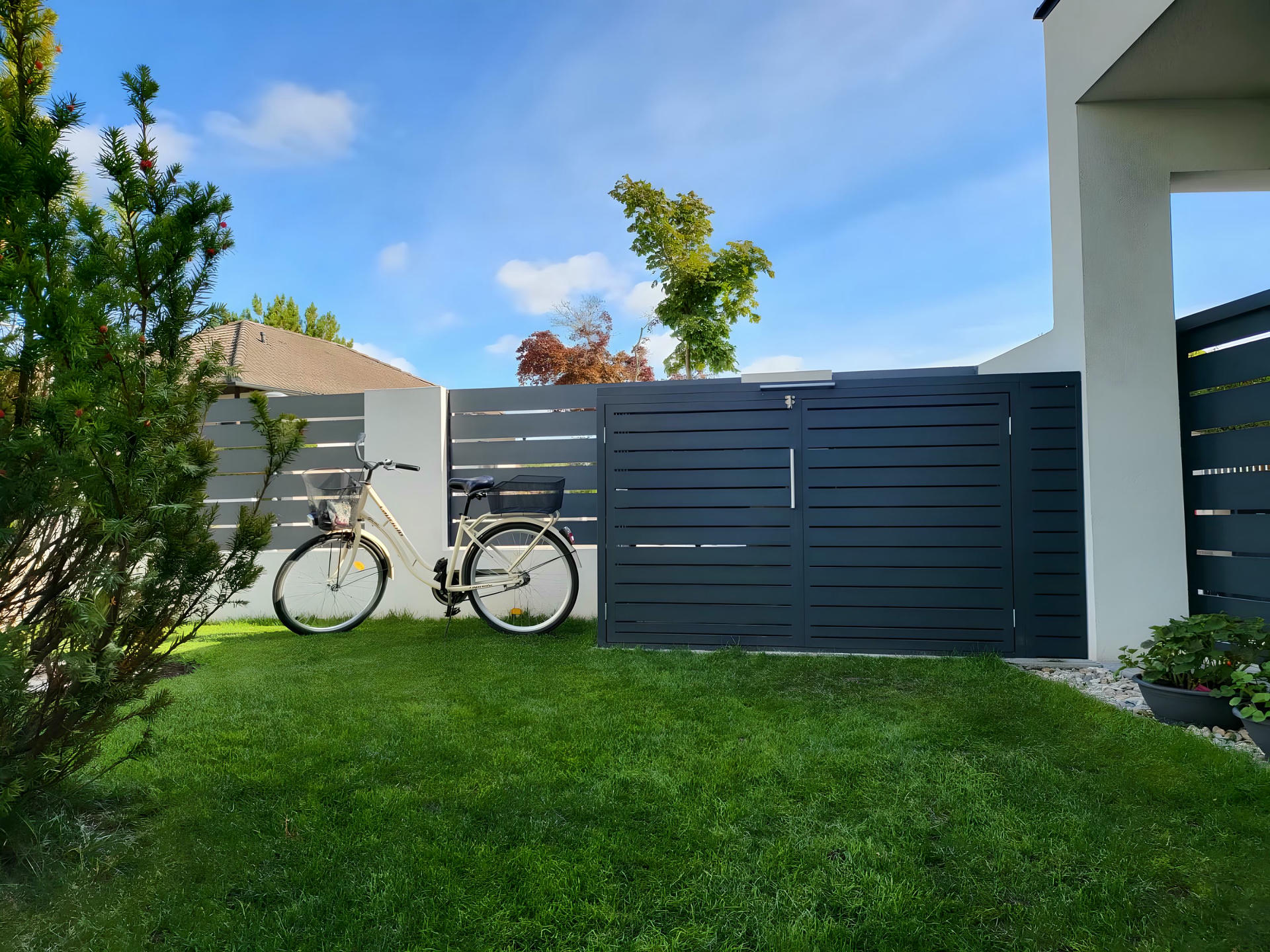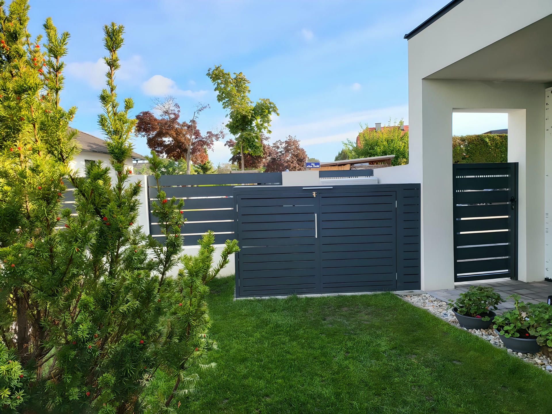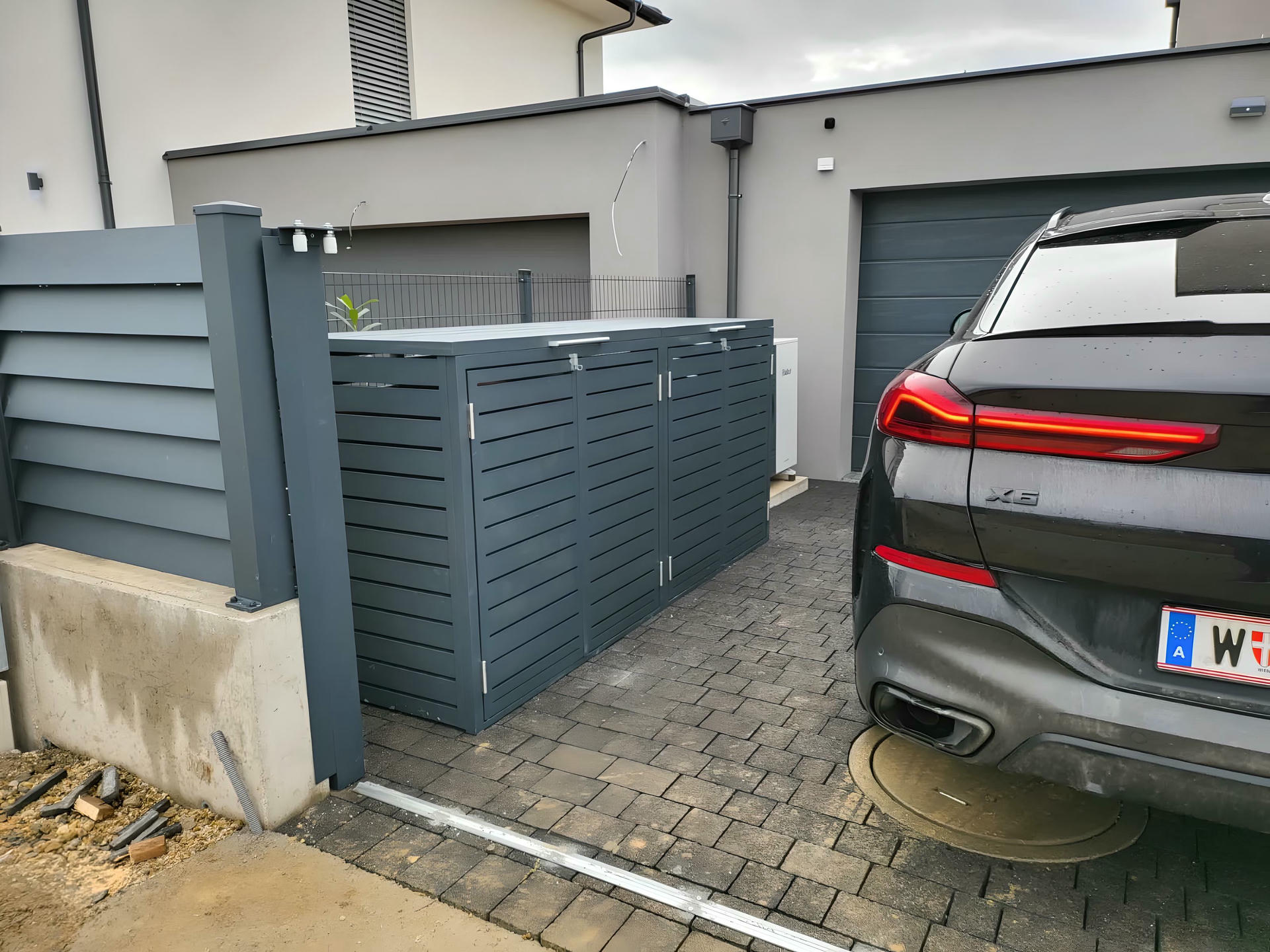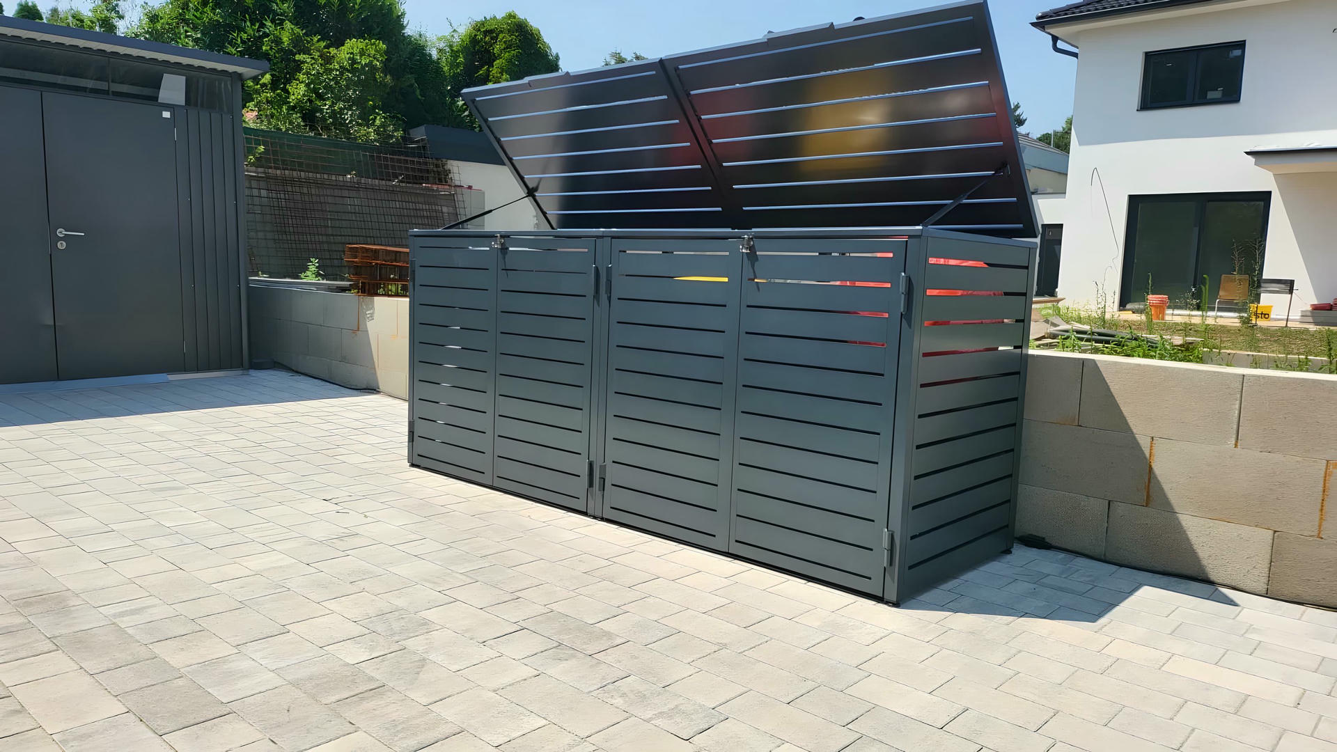 Izrađena sa ravnim horizontalnim lamelama u uravnoteženom okviru, ova kutija ne samo da efikasno skriva kante za otpatke, već i oplemenjuje spoljašnje prostore svojim smirenim i uređenim izgledom.