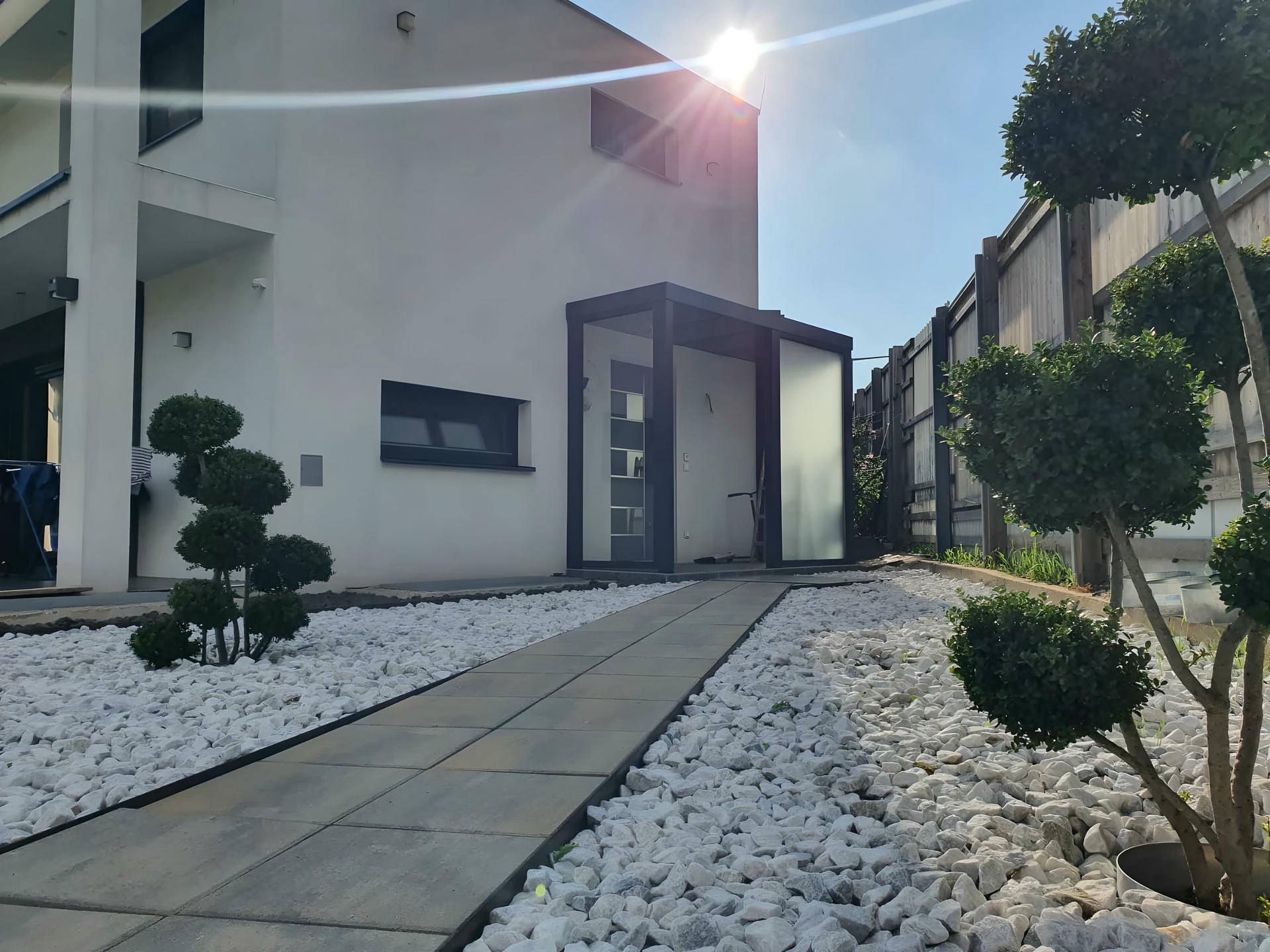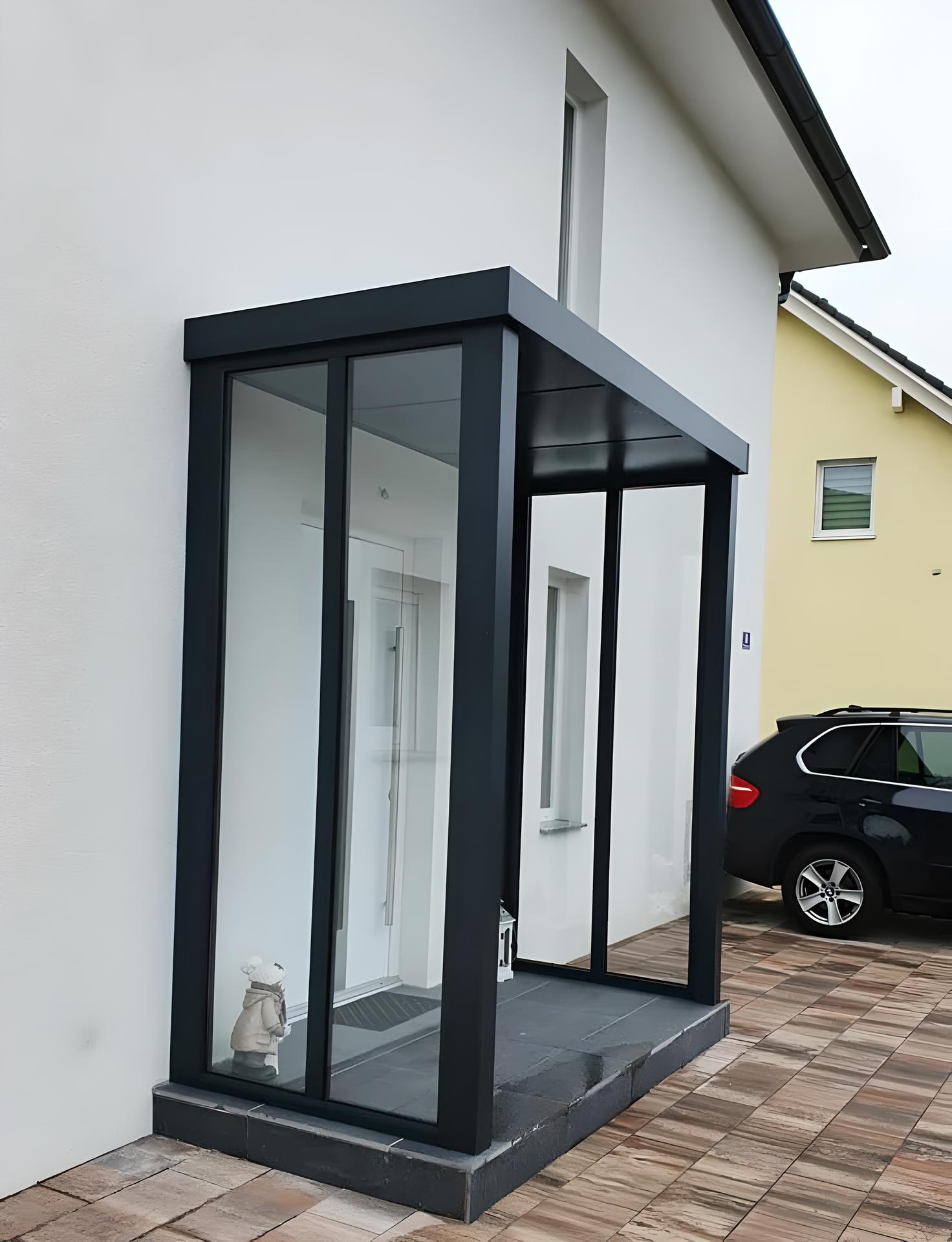 Čiste linije aluminijumske konstrukcije i široki bočni stakleni paneli stvaraju zaštićen, svetao i vizuelno prostran ulazni prostor.