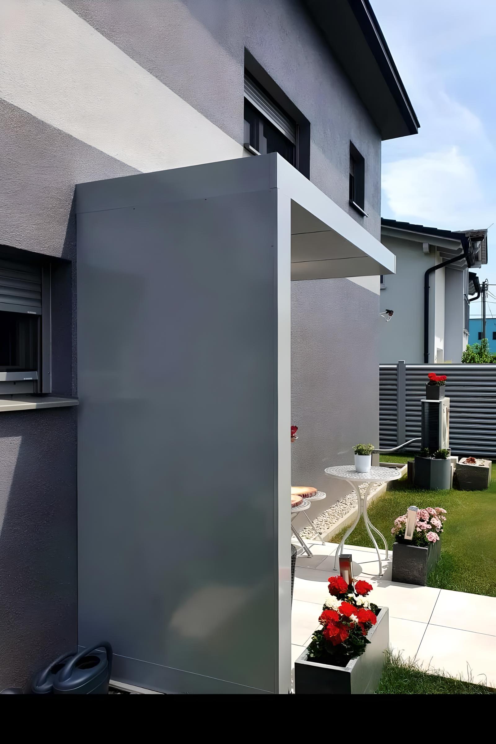 Njena jednostavna, ali moćna geometrija naglašava ulazni prostor, dok čvrsta aluminijumska konstrukcija obezbeđuje zaštitu od kiše, snega i vetra.
