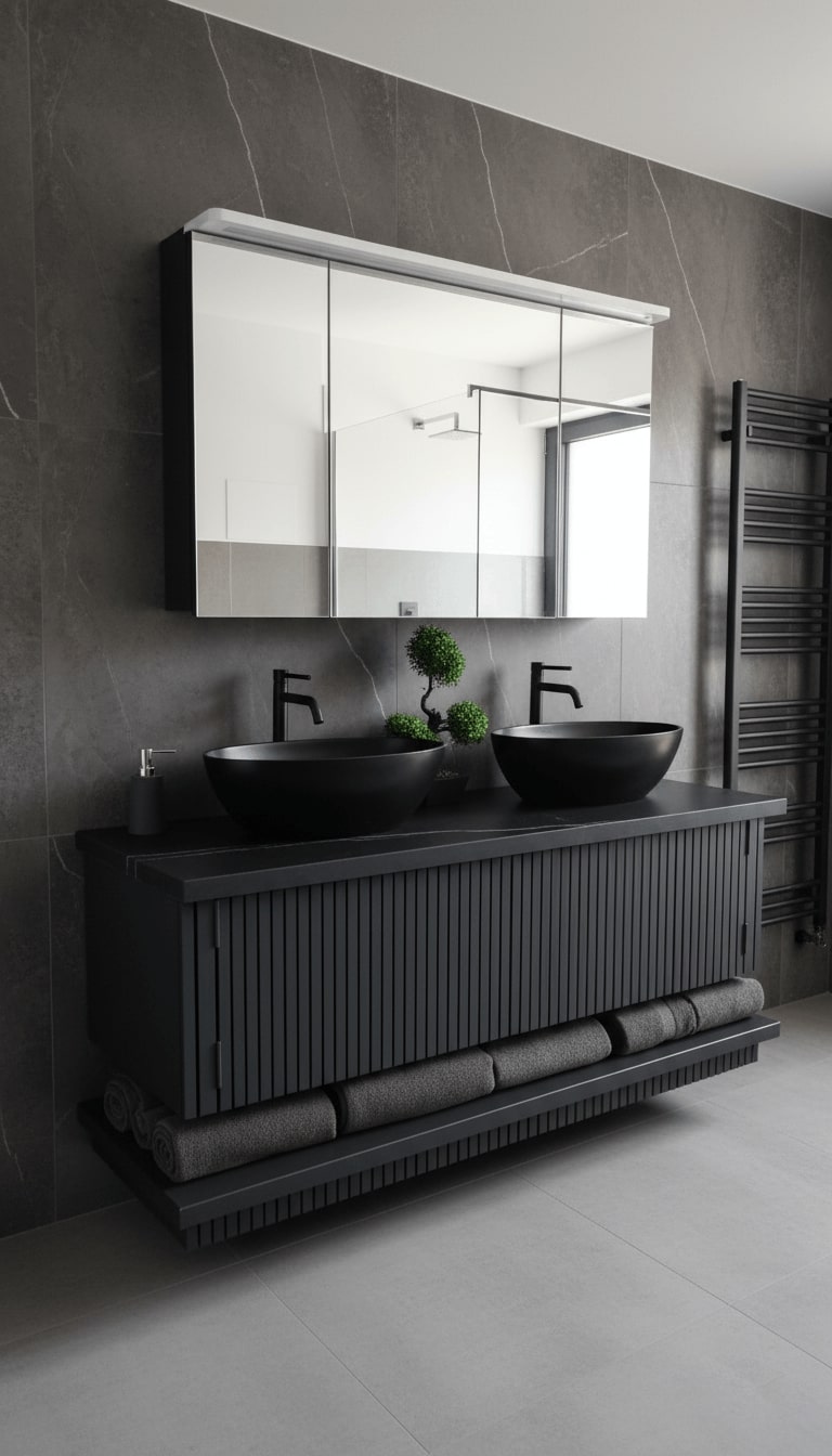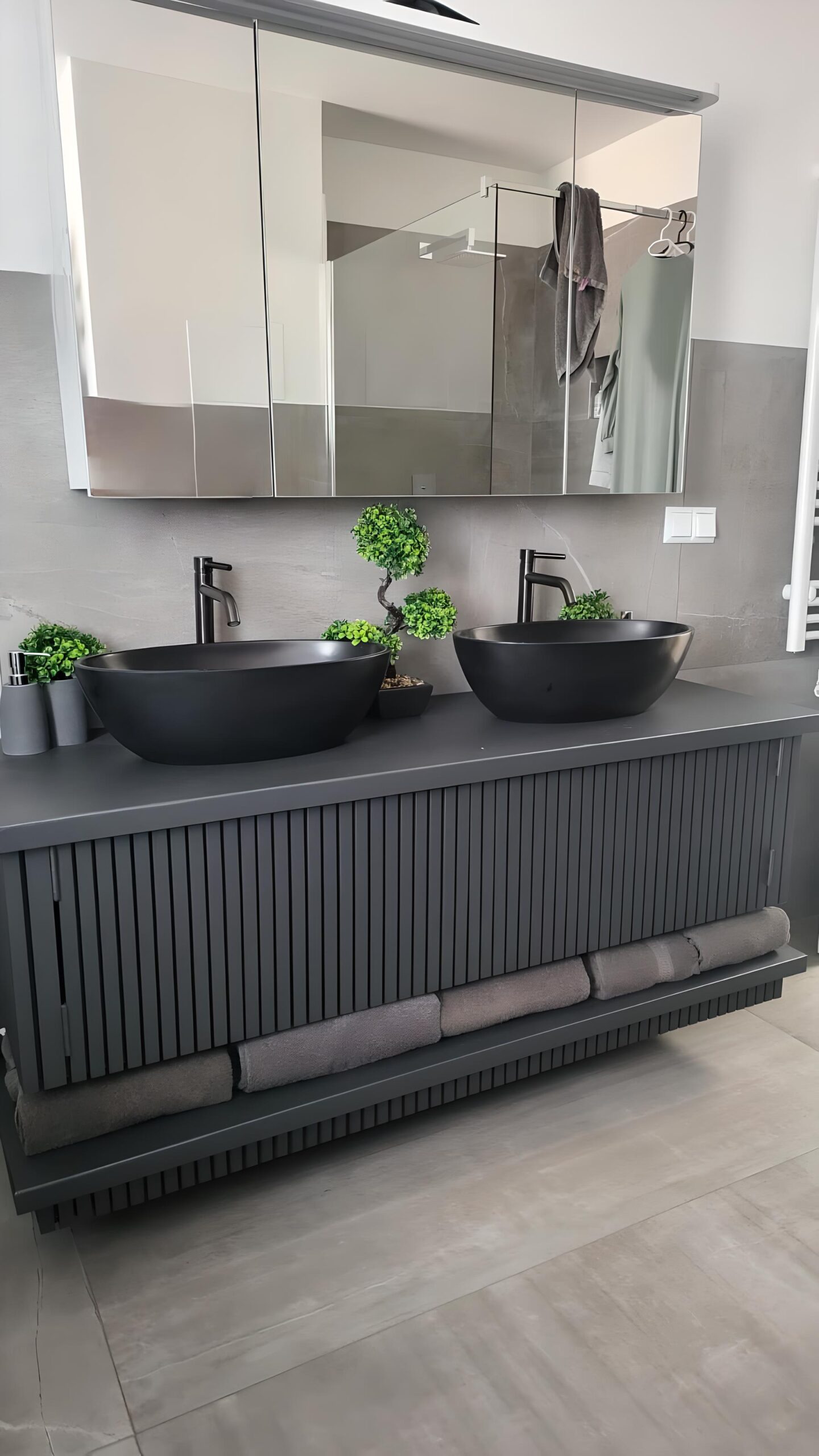 Mat crni umivaonik ormarić sa elegantnim vertikalnim letvicama donosi izražajnu dozu minimalizma, dok dvostruki nadgradni lavaboi stvaraju osećaj luksuza i simetrije.